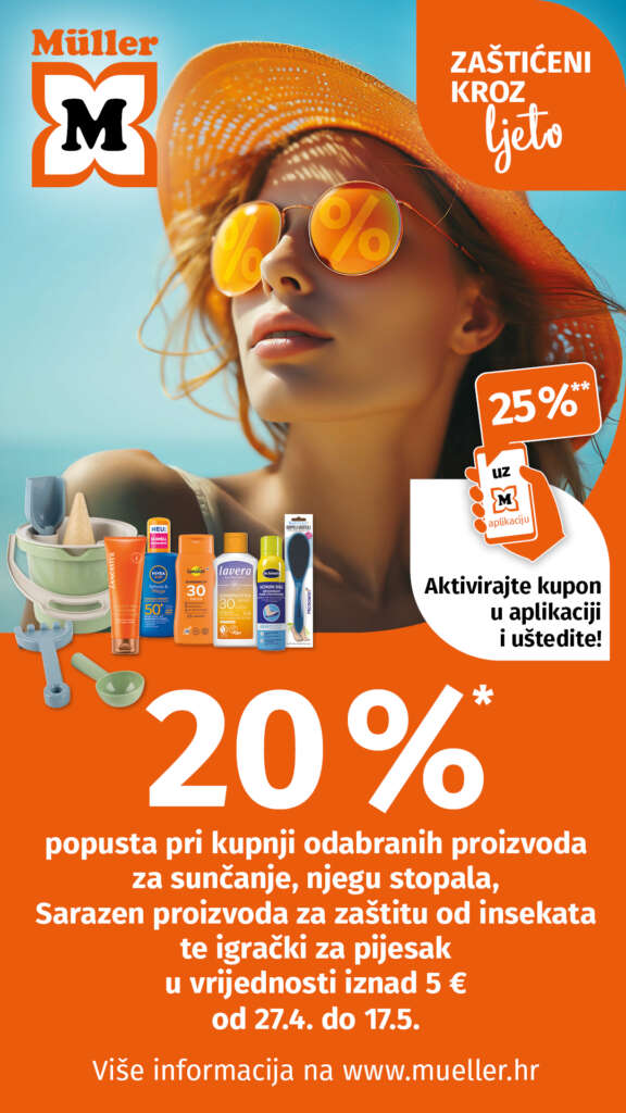 20 %* popusta pri kupnji odabranih proizvoda za sunčanje, njegu stopala, Sarazen proizvoda za zaštitu od insekata te igrački za pijesak u vrijednosti iznad 5 € od 27.4. do 17.5.