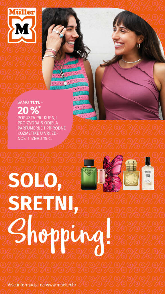 *20% popusta vrijedi samo pri kupnji proizvoda s odjela parfumerije i prirodne kozmetike u vrijednosti iznad 15 €. Popust se oduzima neposredno na blagajni. Različiti popusti međusobno se ne zbrajaju, a akcije isključuju. Popust ne vrijedi na darovne i prepaid kartice svih vrsta. Akcija vrijedi samo 11.11.2025. ili do isteka zaliha u svim Müller poslovnicama u Hrvatskoj. Isplata u gotovini nije moguća. Zadržavamo pravo promjene akcije ili aktivnosti te pravo izmjene roka trajanja akcije ili aktivnosti.