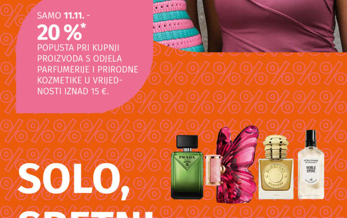 11.11.2025. povodom Singles Daya Trgovima Muller svim kupcima daruje: 20% popusta pri kupnji proizvoda s odjela parfumerije
