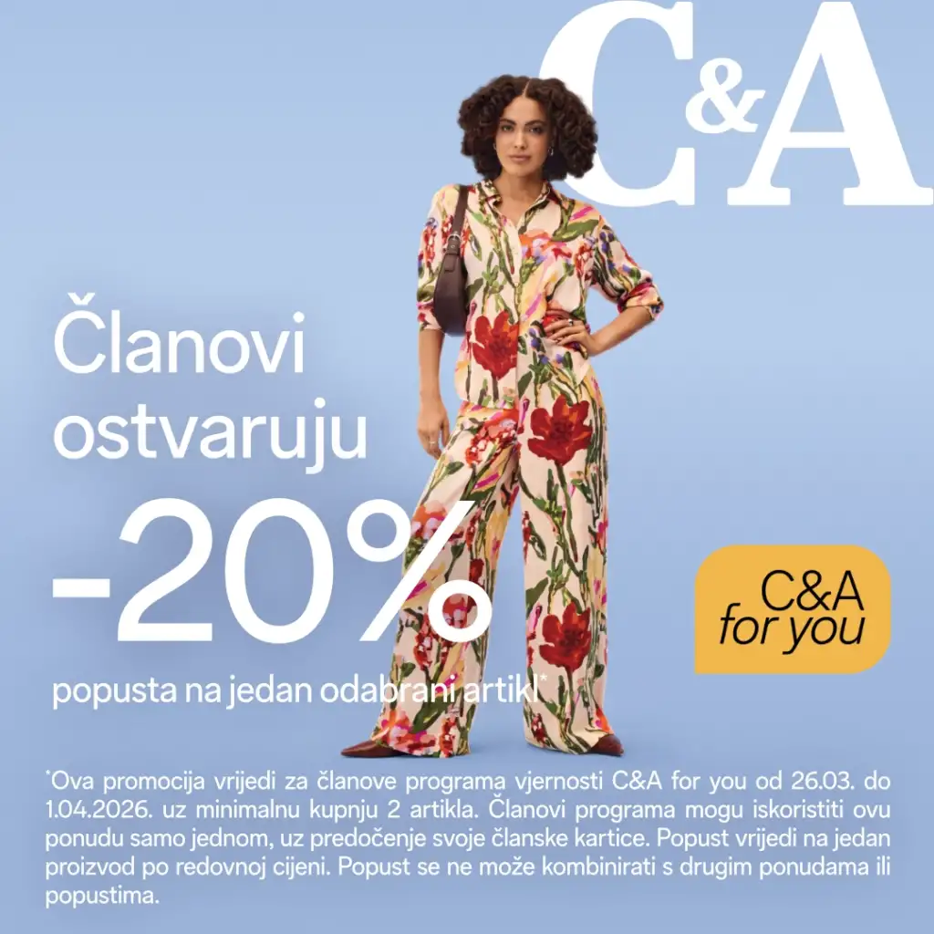 Popust na omiljeni artikl Članovi C&A kluba ostvaruju 20% popusta na jedan odabrani artikl od 26.03. do 01.04. prilikom kupnje minimalno dva artikla. Povratak na Novosti Ana Grabovac2026-03-25T18:15:59+01:00 Podijeli s prijateljima! FacebookXLinkedInTumblrPinterestEmail: